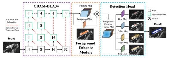 The architecture of R-Centernet+, which mainly consists of the CBAM-DLA34, FEM, and Improved Detection Head. The numbers in the boxes represent the stride to the image.
