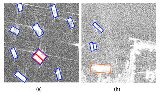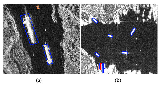 (a,b) Undesired results in the SSDD. Blue bounding box means ships that were detected, red bounding box means ships that were missed, and orange bounding box means false alarms.