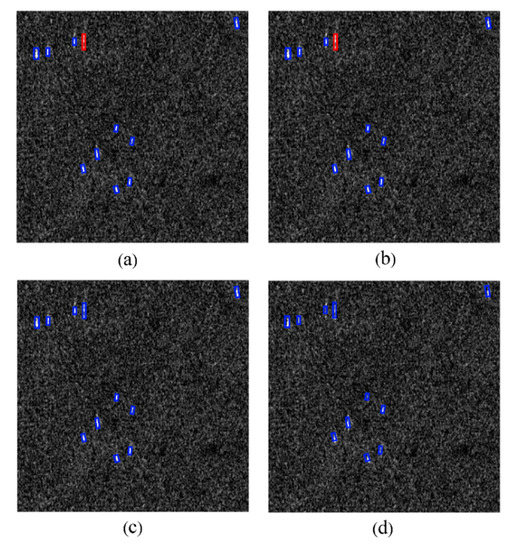 The effect of CBAM. (a) The detection result of the experiment setting of NO CBAM and NO FEM. (b) The detection result of the experiment setting of NO CBAM and YES FEM. (c) The detection result of the experiment setting of YES CBAM and NO FEM. (d) The detection result of the experiment setting of YES CBAM and YES FEM. The blue rectangles indicate detected ships. The red rectangles indicate missed ships.