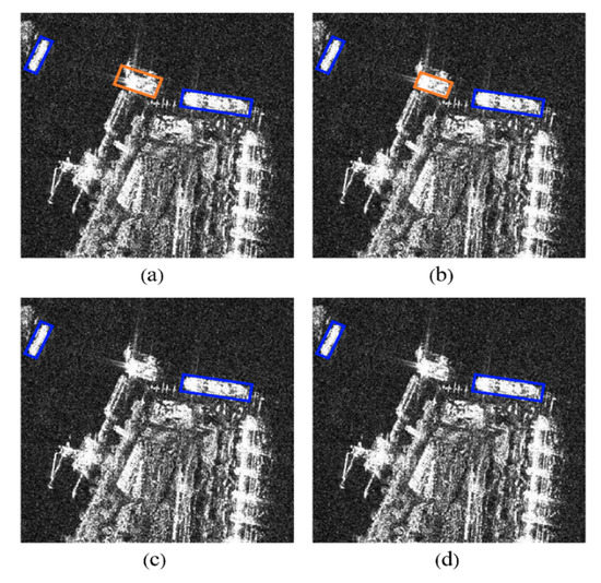 The effect of FEM. (a) The detection result of the experiment setting of NO CBAM and NO FEM. (b) The detection result of the experiment setting of YES CBAM and NO FEM. (c) The detection result of the experiment setting of NO CBAM and YES FEM. (d) The detection result of the experiment setting of YES CBAM and YES FEM. The blue rectangles indicate detected ships. The orange rectangles indicate the false alarms.