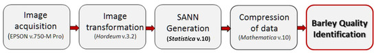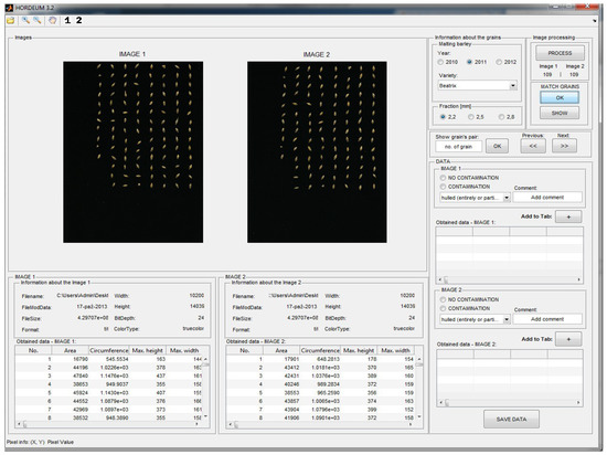 A total of 176 digital images of malting barley kernels of the cultivar Sebastian were acquired. For the processing and analysis of digital images of kernels, the original IT system “Hordeum v.3.2” (see Figure 3) was developed, which is not only dedicated to image processing and analysis but is also a useful tool for the generation of the teaching files for ANN. For the design and construction of the above-mentioned application, GUI (graphical user interface) was used as a standard implemented in the MATLAB 2014b environment (Figure 3). Elements of the Statistica v. 10 statistical package were used to create a neural compressor of graphic empirical data. The standard procedure implemented in the “STATISTICA Neural Networks PL—autoassociative networks—nonlinear dimension reduction” module by StatSoft, described in the Section 2.2 (pages: 7 and 8), was used.