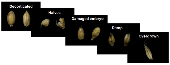 Figure 4 presents examples of 5 typical imperfections of malting barley kernels.