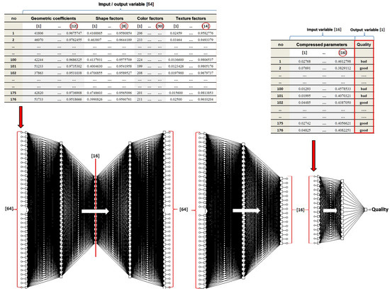 The created MLP (multilayer perceptron) neural model was trained with the use of optimization algorithms implemented in the Statistica package v.10 [5]. According to the procedure implemented to the “Neural Networks” module, the learning process of the auto-associative network was conducted using the standard CG (conjugate gradients) algorithm. The optimization of SANN with the structure: 64:32:16:32:64 was realized in 1000 epochs. Then, the generated network was divided according to its symmetry axis (three hidden layers, Figure 8). The reduced, three-layer MLP SNN: 64-32-16 was further used to generate a new data set consisting of 16 compressed input variables and 176 training cases [27].