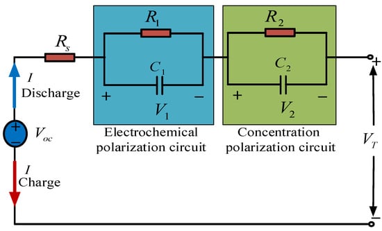The battery is a complex electrochemical system. An accurate description of battery internal and external characteristics is one of the solutions to improve the accuracy of battery SOC estimation. In order to accurately describe the battery characteristics, the electrochemical model [,,], equivalent circuit model [,,], electrochemical impedance model [], and other model-based methods were proposed to solve the SOC estimation problem. The more accurate the battery model is to simulate the electrochemical processes that occur during the battery operation, the more accurate the model will be. The equivalent circuit model has been widely used due to its better model accuracy and higher computational efficiency []. Combined with the model accuracy, calculation amount, and feasibility analysis, the equivalent circuit model second-order Thevenin model is adopted. The second-order RC model can simulate the electrochemical polarization and concentration polarization of the battery, which is one of the most common models of lithium batteries in the actual operation of vehicles. Compared with the first-order Thevenin model, it can more accurately describe the actual characteristics of the battery. Figure 1 shows a second-order Thevenin equivalent circuit model.