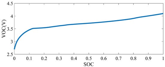 We can fit the OCV–SOC relationship by using the OCV–SOC test, and the test results are shown in Table 1 [].