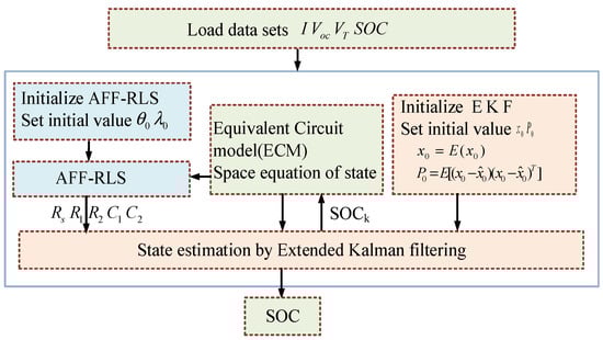 Adaptive forgetting factor regression least-quares–extended Kalman filter (AFFRLS–EKF) algorithm flow chart.