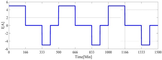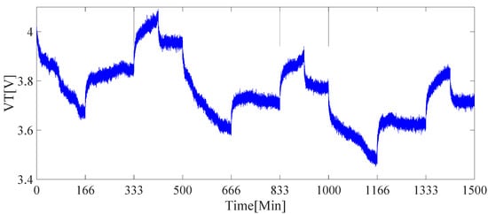 The current curve is shown in Figure 4, and the terminal voltage curve is shown in Figure 5. The current remains positive during 0 to 166 min, which indicates the battery is in the discharge state. When ti = 166 min, the state of the battery changes from the discharge state changes to the open-circuit state. When ti = 333 min, the battery changes from open-circuit state to charging state. The battery state changes at ti = 416 min, 500 min, 666 min, 833 min, 916 min, 1000 min, 1166 min, 1333 min, and 1416 min, respectively. The battery terminal voltage curve is shown in Figure 4, In the battery charging time interval, the measured value of the battery terminal voltage increases, while the voltage at the end of the discharge interval decreases. In the open circuit interval of the battery, the terminal voltage remains unchanged, with slight changes due to the soft changes in the terminal voltage caused by the discharge phenomenon in the R1C1 circuit and the R2C2 circuit.