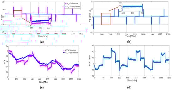 As can be seen from Figure 6a, the error of terminal voltage is large at several ti moments when the battery state changes, indicating that when the battery state changes, the estimation of parameters by the general least square algorithm fluctuates greatly, with the maximum error reaching 9.3789 V. When the battery state remains unchanged, the performance of the least square algorithm is high, and the estimation error of terminal voltage is kept within 0.2 V, as shown in Figure 6b. Based on parameter estimation, EKF is used to carry out SOC estimation. The SOC estimation results are shown in Figure 6c,d. At several special ti moments when the battery state changes, the parameter estimation error is large and the SOC estimation error suddenly increases. In the time interval when the battery state remains unchanged, the parameter estimation effect is good, but the SOC estimation error is relatively weak.