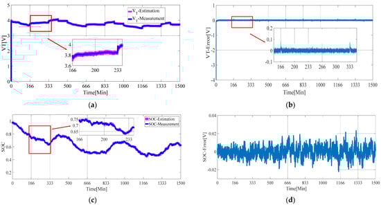AFFRLS—EKF algorithm. (a) Estimated terminal voltage and measured terminal voltage; (b) estimated terminal voltage error; (c) estimated SOC and measured SOC; (d) estimated terminal voltage error.