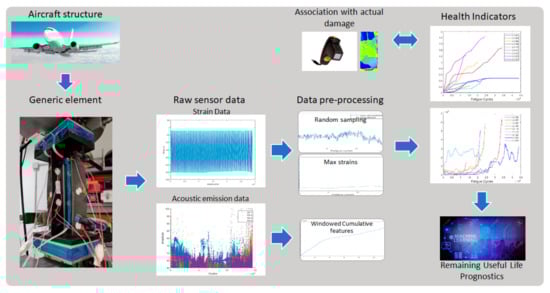 However, to exploit the direct output of a SHM system (i.e., raw sensor data), intelligent data processing and features that effectively capture the degradation process are needed. These features are usually referred to as health indicators (HIs). The quality of the HIs’ evolution over operational time largely determines the effectiveness of diagnostic systems [] and affects the performance of the prognostics methodologies []. As we discussed previously in [], HIs to be potentially used for diagnostic and prognostic tasks should possess the properties of monotonicity, prognosability, and trendability. Monotonicity characterizes a general increasing or decreasing trend of the HI, prognosability measures the spread of the HI failure values, and trendability indicates whether degradation histories of a specific structure/subcomponent have the same underlying trend. HIs can be divided into two categories, as discussed in [,], namely, HIs that are directly derived from physical measurements (pHIs), such as static or dynamic strains, ultrasound, temperature, or a combination of these properties; and virtual health indicators (vHIs), which are not tied to any physical properties, such as the reconstruction error (Q index) from principal component analysis. An example of a pHI can be found in [], in which axial strain from DIC measurements was used to predict the RUL of open-hole composite coupons. Strain HIs were also developed in [] to monitor disbond growth in composite stringer panels. VHIs are usually optimized to obtain desirable attributes, such as monotonicity, trendability, and prognosability, which significantly benefit the performance in prognostics, as postulated in []. Principal component analysis (PCA) is frequently used as a means to create vHIs. Loukopoulos et al. [] applied PCA, specifically the T2 and Q index, as HIs to predict the RUL of reciprocating compressors. Zhang et al. [] used wavelet packet decomposition to extract features in combination with PCA to reduce the dimensionality of the data without losing information. The output of the PCA was used as an input to a Back-Propagation ANN to predict machinery failure. In [], an autoencoder-based Recurrent NN (RNN) is proposed for dimensionality reduction into a 2D feature space. An HI is proposed based on a distance metric and a radial basis function normalization scheme for RUL prediction of aircraft engines.