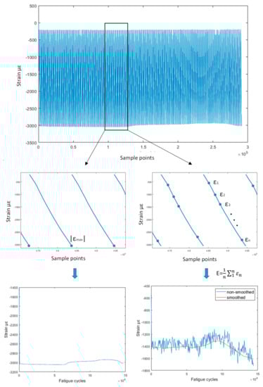 Uniform distribution sampling from the entire quasi-static loading strain measurements was used. The final outcome was passed through a moving average filter for smoothing purposes. Smoothing was also applied to the variable amplitude maximum strain data to lessen the effect of the stepped behavior introduced by the load shifts, and to ensure the data was more comparable with the constant amplitude fatigue. A graphical representation of the two data processing methods is provided in Figure 3.