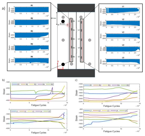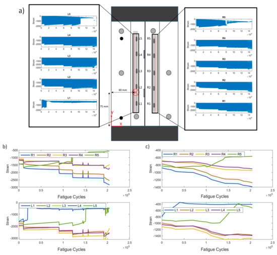 Similar to the constant amplitude test campaign, the same data processing techniques were applied and are presented. A representative specimen (VA-1) is shown in Figure 13a with the sensor positioning and the initial damage (impact) location. The data recorded at each sensor are also presented. The load increases are evident by the increase in the strain values. Moreover, it is important to note that sensor L1 is disbonded from the early stages of the test, whereas L5 and R5 disbond near the final stage. This can be deduced from, in addition to visual inspection, the significant change in the strains. These data were considered in the following steps to display the robustness of our HIs. The strains extracted using the two processing methods can be seen in Figure 13b,c.