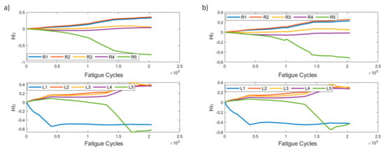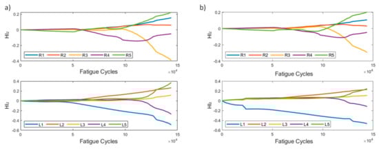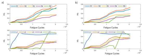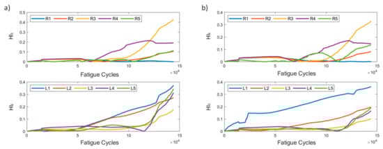 HI2 (Figure 15) displays similar trends as those seen in the constant amplitude fatigue campaign. The HI is slowly increasing until the 40k cycle mark, where the curves for sensors R1, R2, and R5 start to rapidly diverge, whereas R3 and R4 remain constant throughout the entire lifetime. The left foot sensors increase until 40k cycles, and then remain constant until 130k, where L1–L3 increase and L5 starts to decrease. In method 2, the right foot sensors display significantly lower values than their method 1 counterparts, but the overall behaviors are similar. Even prior to disbanding, R5 and L5 contribute most to the cumulative strains.