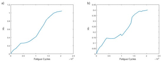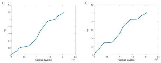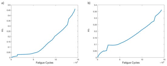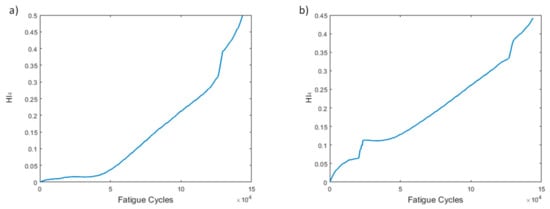 HI3 (Figure 16) shows almost identical behavior in both methods. A monotonous trend increasing over time, with a small number of constant slopes at the beginning and near the end, is shown. HI3 shows larger values when using method 1 for preprocessing, an expected outcome because the max values of the strain are higher. Once again, the main attribute of the HI, i.e., monotonicity, is achieved.
