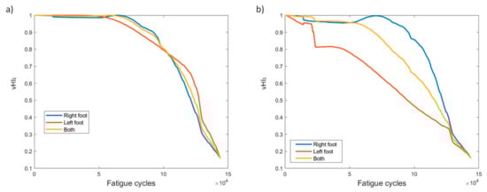 The first of the virtual health indicators, vHI1, is presented in Figure 9. At first, the HI was calculated separately for each foot to observe the differences in behavior. The observation, as shown more clearly in Figure 9b, is that the HI is affected by “aggressive” behaviors, like that from sensor L1. As evidenced in Figure 4c, sensor L1 shows an “aggressive” increase in values unlike that of any other sensor. This is also projected in vHI1, where the left foot instance of method 2 decreases faster than in method 1. Hence, we investigated the effect if the indicator is calculated jointly for both feet, i.e., instead of calculating vHI1 for left and right foot FBGs separately, it was calculated for the combination of the ten FBG sensors. The result displays a more gradual behavior than that of the left foot, while also retaining aspects of both feet. This was also the case for the remainder of the specimens. To focus on the results of Figure 9, we observe that the indicator decreases gradually from 1 to 0.2 when the specimen fails. The consistency between the two pre-processing methods is slightly diminished; however, due to the nature of vHI1, a desirable monotonic behavior is achieved with both methods.