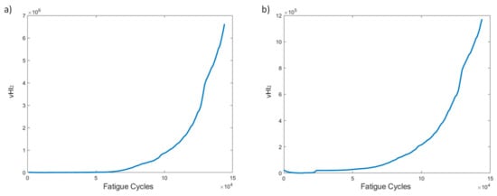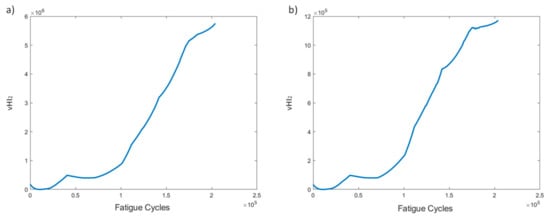 VHI2 shows an increasing trend over time (Figure 19). The major difference between the two pre-processing methods is the scale of the HI. Other than this, no major differences are noted. A gradually increasing trend, which increases faster after 60k cycles, is observed. It should be noted that this indicator provides a promising trend for prognostics, regardless of the processing method and experimental conditions.