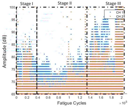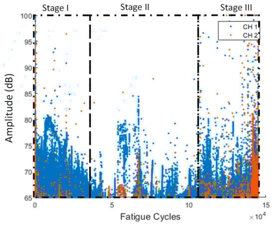 As we mentioned previously, AEs were constantly recorded throughout the total duration of the tests. In Figure 11, the amplitude vs. cycles can be observed. Initially, AE is high because the initial damage quickly starts to propagate (Stage I). After the first evolution, the initial damage is better accommodated by the structure through stress redistribution and does not grow significantly, reducing the acoustic activity until later stages of the experiment (Stage II). In the final stage (Stage III), the damage is starting to grow once more, leading to the final failure, which is indicated by the extensive acoustic activity.