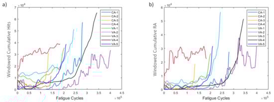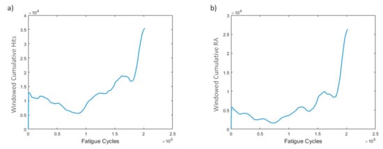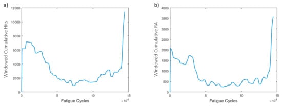 Two HIs are extracted from the acoustic emission data: the windowed cumulative hits and RA. The resulting curves (Figure 12) display an increasing trend, especially near the end of life. In the early stage, both features display slightly higher values due to the early damage growth, and in the middle stage a drop in values is observed, and thereafter the values remain almost constant. Near the end of life (EoL), the HIs display a sudden increase, which is also visible in the amplitude graph. It is evident that this specimen does not have high monotonicity, but it is shown later that other specimens display more promising behaviors. However, worth mentioning again is that, near the EoL, an increasing trend is observed.