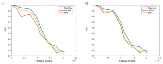 VHI1 displays a gradually decreasing behavior from 1 to 0.2 (Figure 18). Again, using all sensors to calculate the HI provides a similar behavior to the average of the two feet independently and, in this particular specimen, eliminates the increase observed at the final moments in the left foot case. A good trend overall is displayed when using this HI in variable amplitude fatigue, regardless of the data processing method.