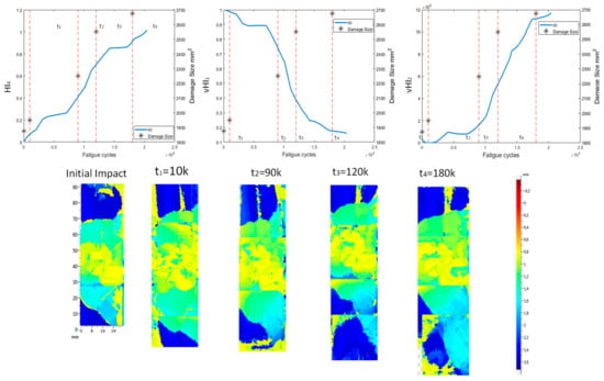 As previously stated, in the variable amplitude fatigue experiments, the damage was also monitored via a portable phased array camera. An initial C-scan of the damage area was performed pre-test and, at every 10,000–20,000 cycles, the test was paused and the SSP was inspected for damage growth. The outcome of this inspection, i.e., the extent of growth in the damage, informed the decision to increase the fatigue load level. The phased array images provided quantitative information on the extent of damage.