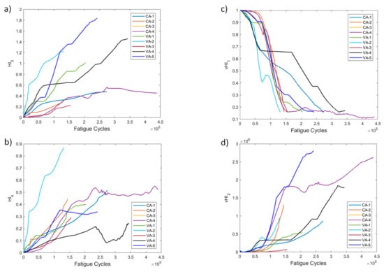 Several HIs for both constant and variable amplitude fatigue were developed and their performance was presented throughout fatigue tests. The strain-based HIs, i.e., HI1 and HI2, were used in [] to successfully detect damage in quasi-static numerical tests. The HIs investigated in the present work are intended for diagnostic and prognostics tasks in which monotonic trends are highly desirable; hence, the proposal of the fused HIs. In Figure 23a–d we nominate and present the four most interesting HIs, i.e., HI3, HI4, vHI1, and vHI2. These are presented comparatively for the specimens of both experimental campaigns. Because, as we previously noted, both data processing methods provide similar results, method 2 is used hereafter. The random sampling method is preferred for addressing the effects of different loads and displaying the robustness of these HIs in different loading conditions. HI3 and HI4 are shown in Figure 23a,b. Monotonicity is achieved in all specimens throughout the lifetime. Although monotonicity and similar behaviors (trendability) are highly desirable attributes, a concern is presented in the form of a lack of common failure values (i.e., moderate prognosability). Similar attributes are observed in the behavior of vHI2, i.e., high monotonicity but moderate prognosability. However, higher variability is observed in the vHI2 index due to the much higher overall values. vHI1 displays a decreasing trend whose range is restricted by the radial basis function normalization. It should be noted however, that vHI1 requires a priori knowledge of the minimum and maximum values for the normalization. It is presented as a concept due to the relatively promising decreasing trend it possesses. As previously stated, a solution to this drawback is the inference of minimum and maximum values from a training dataset.