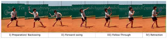 Additionally, Ref. [19] separates tennis shots into several sequential stages, which are outlined on the example of a forehand shot in Figure 1: