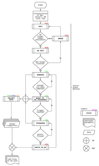 For example, the triggering procedure, responsible for recognizing the tennis shots, is located in timer 1 (TIM1), which runs with 1 . Triggering is done in the states RUNNING, READY_TO_BE_TRIGGERED, and TRIGGERED and is further described in Section 2.1.3. The basis for triggering is the accelerometer and gyroscope data, which are saved as signals in circular buffers [31]. The magnetometer and the pressure signal are collected in TIM2, which runs with 100 , since the ODRs of the respective sensors do not allow faster sampling. An exception is the audio data which is gathered in TIM3 with the highest sampling rate, namely 8 , to capture all the expected frequencies during a tennis shot.