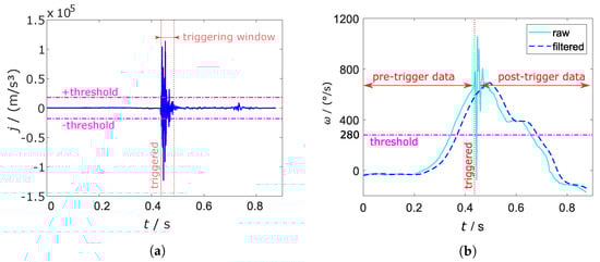 Due to the delay of the filter, a window with a size of 50 is implemented. Both thresholds must be exceeded in the latter; otherwise, the trigger is not set. Figure 4a shows the triggering window for the first overshooting of the threshold. The window is restarted after the threshold is surpassed again.