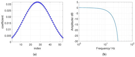 The angular velocity around the y-axis might be a suitable representative of the pure swing components as is illustrated in Figure 4b. It exhibits a high peak for all shot types. Nevertheless, is also high during shocks which arise, for example, when running or hitting the racket on the ground. Hence, the threshold is compared to a low-passed signal. The finite impulse response (FIR) filter is designed to cut frequencies higher than 15 with an order of . It is designed with a Kaiser window function. The filter coefficients and the magnitude response is illustrated in Figure 5.