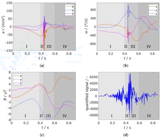 Visualisation of the 10 sensor signals of a forehand topspin with annotated sequences as mentioned in Section 1.2: (a) x, y, z component of the accelerometer, (b) x, y, z component of the gyroscope, (c) x, y, z component of the magnetometer, and (d) quantified audio signal.