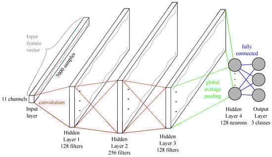 FCNs were first presented for a time series classification problem in 2016 by [44]. The FCN for the shot classification is built with four hidden layers, and the input and output layer. The main components are the three convolution blocks. The first convolution consists of 128 filters with a length of eight; the second contains 256 filters with a filter length equal to five. The last convolution reduces the number of filters back to 128 and the filter length to three. Every convolution is pursued by a batch normalization [45]. The output of the batch normalization is fed into a Mish activation function [46]. After the third convolutional block, a global average pooling (GAP) layer [47] is applied, followed by a softmax operation [48]. Furthermore, the length of the time series is kept constant with adequate zero-padding until the GAP layer. Figure 7 shows the complete architecture of the FCN.