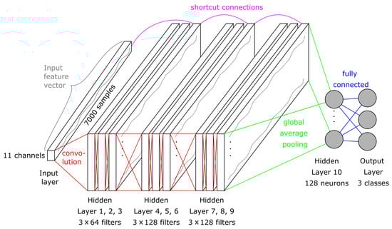In 2016, the researchers in [44] released a relatively deep ResNet for time series classification. This architecture consists of the indispensable input layer, nine convolutional layers, and one GAP layer that is fully connected to the output layer with the classical softmax activation. The nine convolutional layers are dividable into blocks of similar structure: The first of these three blocks consists of three convolutions with 64 filters of size eight, five, and three. Each convolution is followed by batch normalization and the Mish activation function, apart from the last one.