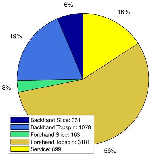 - Wrist-worn wearables, using the dynamic time warping (DTW) algorithm [13,14], can achieve a shot classification accuracy of up to 99%, but remain close to 80% for topspin and backspin detection [15]. Another technology for wrist wearables compared neural network approaches to feature recognition and reached a success rate of 94% for groundstrokes [16]. A study published in 2017 by [17] generated data with an IMU, worn at the wrist, and also compared several approaches for shot classification. In general, the rather classical support-vector machine (SVM) performed best with an accuracy of 97.4% for the groundstrokes, specifically the forehand, backhand, service and false shot. Whiteside et al. also implemented a nine-shot type classifier with a mean accuracy of 93.2%. The SVM classifier distinguishes between forehand topspin, slice and volley; backhand topspin, slice and volley; serve; smash; and false shot. The support vector machine is followed by a deep neural network classifier, reaching an accuracy of 96.6% for the four groundstrokes. The extended version reaches 90.4% for the nine shot types classifier.