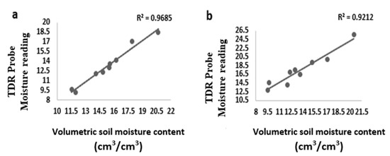 Soil water content was measured using the TDR and the Gravimetric technique. These two techniques measured different values of soil water content for the same soil type at the same field capacity. A correlation was used to establish a relationship between the TDR readings and the gravimetric reading to give a good reflection of Available Soil Water Content (AWC) for the two soils used for the experiment to maintain continuous and constant FC% for each treatment [50]. The comparison of TDR probe moisture values and gravimetric moisture values plotted against each other revealed a very high correlation between TDR probe moisture values and gravimetric moisture values estimated in the laboratory.