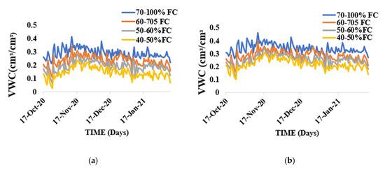 Variation in soil water and amount of irrigation water applied during the growing season of tomato growth in sandy loam and silty loam soil indicates a higher irrigation water application during the anthesis stage and fruits development and expansion stages of the plants’ growth. This is the stage in the crop’s growing cycle where biophysical, biochemical, and physiological processes are critical and requires more water to optimize crop productivity. Daily volumetric soil water content for various water stress treatments for both soils is shown in Figure 2a,b.
