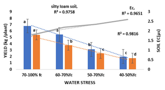 Relationship between sandy loam, silty loam, Ec, and water stress (same alphabet means no significant difference).