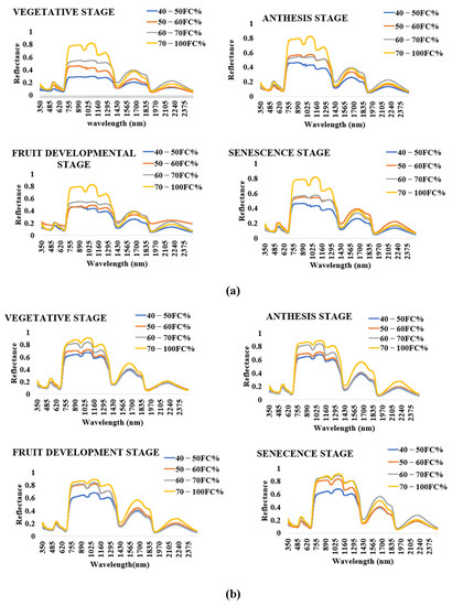 Spectral signatures of the tomato plant leaves at different growth stages for different % FC level for silty loam soil and sandy loam soil: (a) spectral signatures of the tomato plant leaves at different growth stages for different % FC for silty loam soil; (b) spectral signatures of the tomato plant leave at different growth stages for different % FC level for sandy loam soil.
