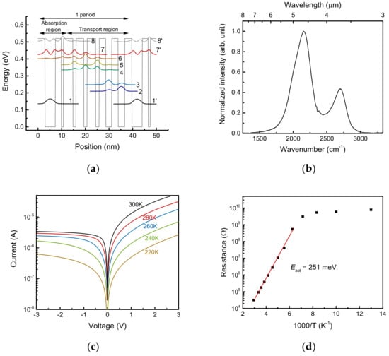 The dark voltage–current characteristics measured at various temperatures over 220–300 K, with 20 K intervals, are shown in Figure 1c. An asymmetric behavior originating from the band structure was observed. Figure 1d is an Arrhenius plot of the differential resistances at zero bias. The estimated activation energy of the device was 251 meV, which corresponded to the transition energy between E61 (264 meV) and E51 (228 meV). This indicated that the dark current induced by the transition from the ground level 1 to the 5–2 levels in Figure 1a was suppressed in the coupled-quantum-well design.
