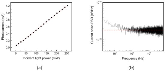Figure 2a plots the output photocurrent as a function of the incident light power. The incident light was the 2220 cm−1 continuous wave (CW) distributed-feedback QC laser described below. The photoresponse exhibits good linearity with the incident light power up to 250 mW; the slope derived from the linear fit was estimated to be 4.7 mA/W for the specific wavelength of 2220 cm−1 (without compensation for the coupling losses from the focusing lens, surface reflections of the optics, and the cleaved facet acceptance area of the QC detector). Simultaneously, the peak responsivity at 2160 cm−1 was 5.7 mA/W, determined from the ratio of the signal intensities between the two wavelengths in the response spectrum in Figure 1b. Figure 2b plots the current noise power spectrum density of the QC detector at room temperature, obtained with a low-noise current amplifier (LCA-40K-100M, FEMTO, Berlin, Germany) and an audio analyzer (SR1, Stanford Research Systems, Sunnyvale, CA, USA). At frequencies higher than 100 Hz, the measured flat noise level matched the calculated Johnson–Nyquist noise level for an 89-kΩ device resistance. Due to the excellent low noise in bias-free operation, the detectivity was improved despite the low responsivity relative to other MIR detectors. The calculated noise-equivalent power was 7.7 × 10−11 W/Hz1/2, with a peak responsivity and flat noise level of 4.4 × 10−13 A/Hz1/2.