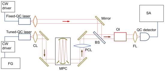 Schematic of heterodyne spectroscopy. FG: function generator, MPC: multi-pass cell, CL: collimating lens (ZnSe, aspheric, working distance of 3 mm), PCL: plano-convex lens (CaF2, focal length of 300 mm), FL: focusing lens (ZnSe, aspheric, working distance of 1 mm), BS: beam splitter, OI: optical isolator, and SA: spectrum analyzer.