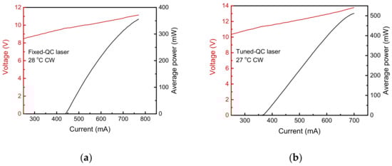 Continuous-wave current–voltage–light output characteristics of (a) the fixed quantum cascade (QC) laser operated at the heatsink temperature of 28 °C and (b) the tuned QC laser operated at the heatsink temperature of 27 °C.