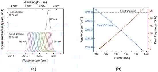 The injection current of the fixed QC laser was set to 625 mA to maintain the 2220.6 cm−1 emission wavelength, as shown in Figure 5a, where the Fourier-transform infrared spectrum was calibrated with a N2O absorption line. To generate a wide-band beat signal, the injection current of the tuned QC laser was varied in a mode-hop-free manner, as exhibited in Figure 5a,b. The frequency of the heterodyne beat signal was tuned from 40 MHz to 26 GHz by varying the injection current of the tuned QC laser over the range 407–494 mA. The frequency of the heterodyne beat signal could be calculated from the difference in wavelengths of the fixed and tuned QC lasers. In Figure 5b, the beat frequency was thus calculated from the fixed and the varied wavelengths for a certain injection current, with good agreement with the measured beat frequencies. Hence, broadband heterodyne spectroscopy could be performed with the well-controlled beat signal over 25 GHz.