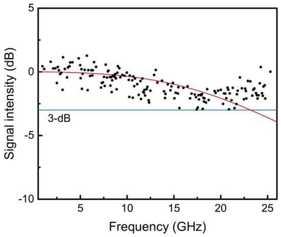The frequency response of the QC detector shown in Figure 6 was measured with the heterodyne setup (Figure 3), without the multi-pass cell, and recorded in the max-hold trace mode of the spectrum analyzer (N9000B, KEYSIGHT TECHNOLOGIES, Santa Rosa, CA, USA). The result was normalized at 0 dB by using the average of the data below 3 GHz, and the signal level was maintained over 35 dB for the entire the frequency range. The theoretical curve based on an equivalent circuit model [] is also exhibited in Figure 6. Due to the reductions in the parasitic capacitance and inductance, a 3-dB cutoff frequency over 20 GHz was confirmed. The experimental data differed with the theoretical curve at around 25 GHz because of a small impedance mismatch between the device and the measurement system in the high-frequency range. Such a behavior of the frequency response was possible to clear up with measurements over 30 GHz; however, this was limited by our instrument. The optimization of a QC detector for radio-frequency operation was reported in Ref. [], where a well-designed coplanar waveguide was used to match the 50 Ω impedance, and no noticeable artifacts appeared in the frequency response up to 50 GHz. However, for broadband heterodyne spectroscopy, the variation of the beat signal intensity up to 25 GHz can be regarded as within the 3-dB cutoff.