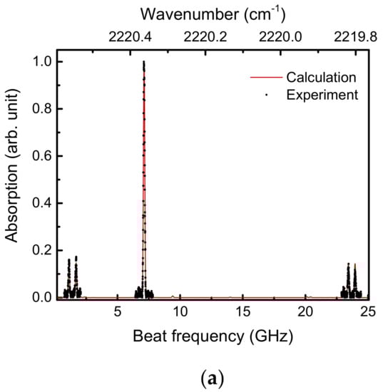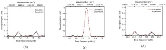 Figure 7 plots the heterodyne spectroscopy of the N2O absorption lines. Figure 7a shows the entire measurement range, while Figure 7b–d were enlarged spectra. Each absorption signal was extracted by using the background obtained with the empty multi-pass cell. The black dots and red lines correspond to the experimental and calculated results, respectively (SpectraPlot [,]), where both were normalized by maximum values around 2220.4 cm−1. The experimental absorption strengths, peak positions, and spectral widths in the three spectra agree well with the calculations in the spectral range of ~0.8 cm−1.