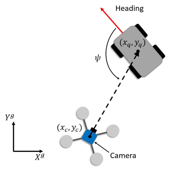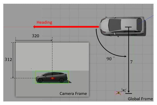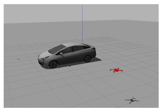 The Gazebo simulator under the ROS framework (version 18.04, Melodic) is used to conduct the simulations to verify the efficacy of the developed control algorithm, and the source code is posted on GitHub for public access (https://github.com/Networked-Control-Robotics-Lab/uav_nmpc_tracking_task.git) (accessed on 5 August 2021). A quadrotor implemented with the developed controller is deployed to track a moving vehicle. The initial locations of the target and the UAV are and and the initial orientations are and respectively, in the global frame as shown in Figure 5. The target moves on the plane following the nonholonomic dynamics, and its velocity is controlled by the user commands with a loop rate of 80 Hz. The resolution of the captured image is , and the intrinsic parameters of the camera are