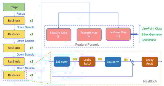 The network structure of a YOLO network, which take resized images as inputs and can generate three outputs, i.e., pose, bounding box, detection.