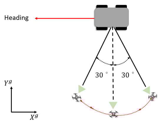 The scenario of Simulation 1 is depicted in Figure 7. The controller designed in Section 4 was implemented to track a target at a time-varying angle. In Case 1, the rotational dynamics was not considered in the dynamics model, and the relative orientation was measured directly using a YOLO network. In Case 2, the angle dynamics was taken into consideration in the UKF, which made the relative orientation more robust to noisy or intermittent measurements from the YOLO network.