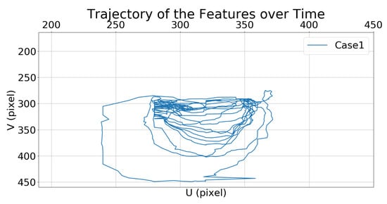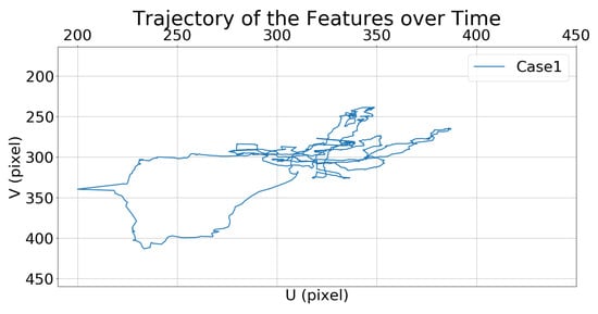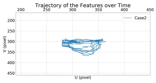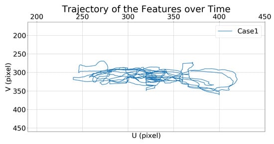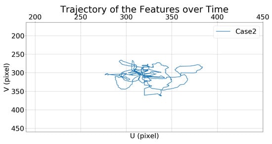 Figure 15 and Figure 16 show the trajectories of the target features in the image frame over time, which indicate that the feature trajectory in Case 2 moves over a smaller range compared to that in Case 1.