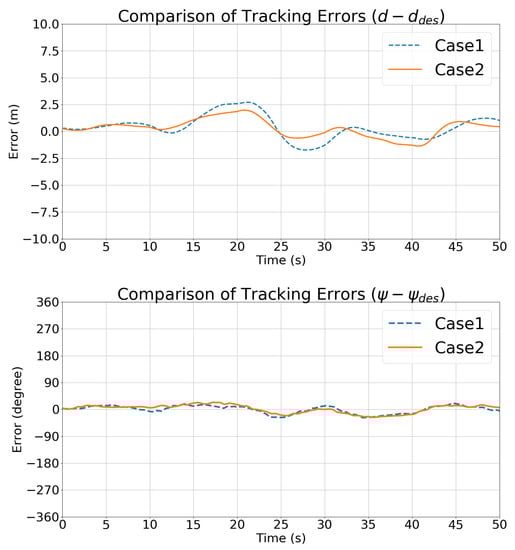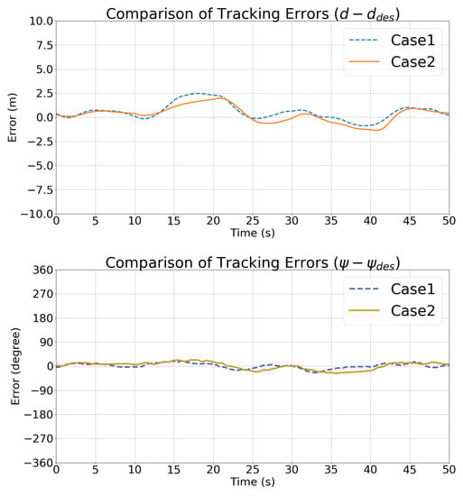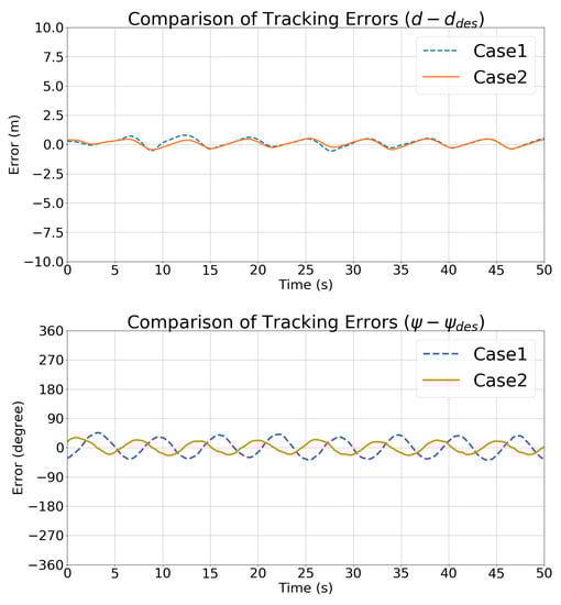 Figure 17 compares the depth and relative angle tracking errors in Case 1 and Case 2, which also shows that Case 2 performed better than Case 1. Thanks to the motion pattern estimated using the UKF, the controller developed in Section 4 performed better than the traditional optimal controller with differential control cost.