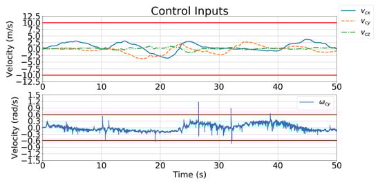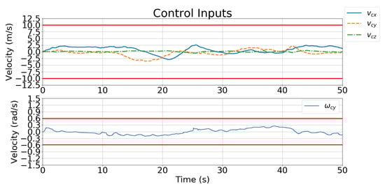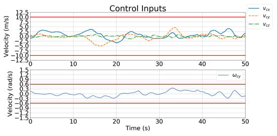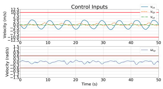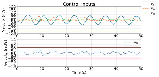 Figure 18 and Figure 19 show the velocity control inputs for Cases 1 and 2, respectively, and the upper and lower bounds on the control inputs defined in Table 2 are highlighted. The control inputs were much more stable and smoother for Case 2 than for Case 1.